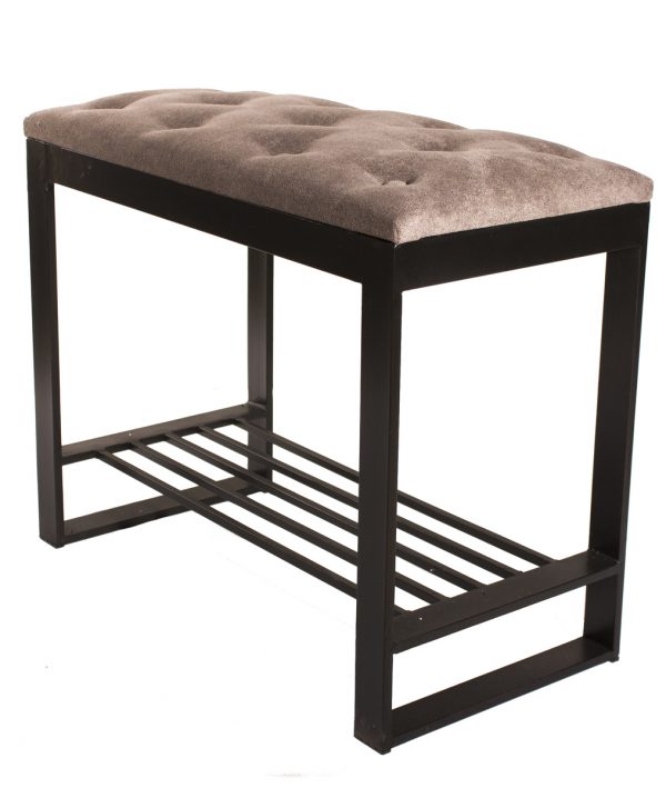 Кований пуф – банкетка з полицями для взуття. Каркас – метал. Фарбування чорного кольору. Оббивка тканини з гудзиками.