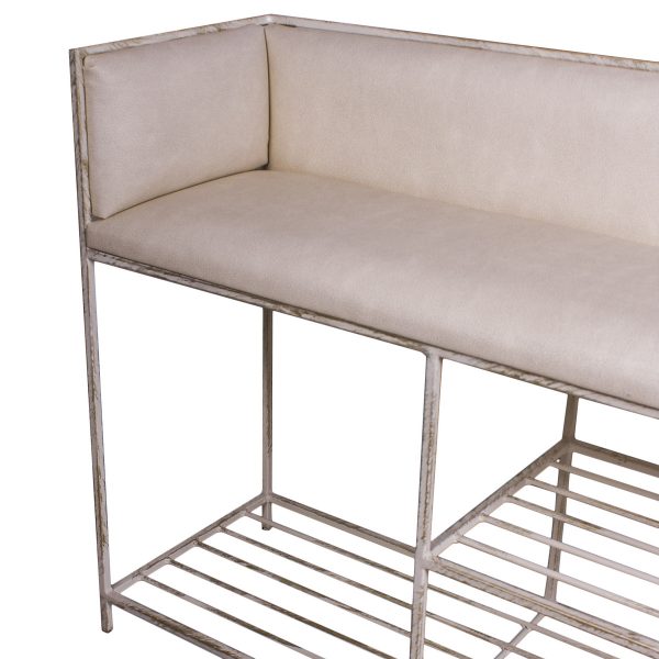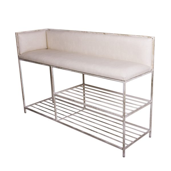 Кований пуф – банкетка з полицями для взуття, який практично і стильно розміститься в кутку вашого передпокою. Каркас – метал тр10*10. Фарбування білий колір. Оббивка сидіння -ЕКО-ШКІРА колір на вибір.