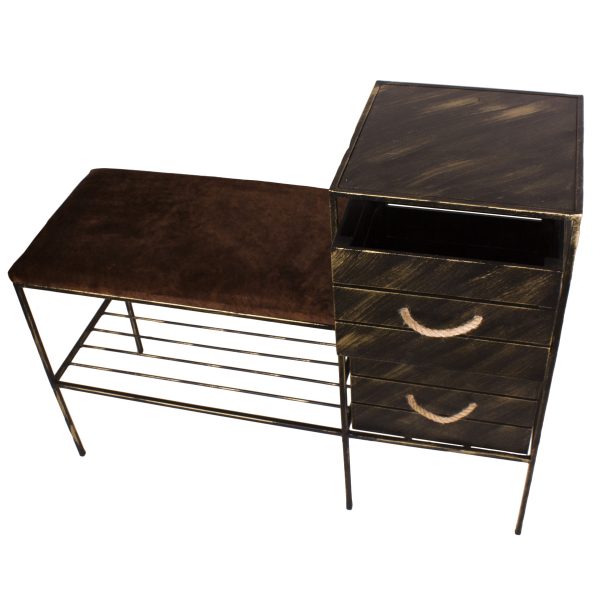 Чудовий м’який та стильний кований пуф, для вашої затишної передпокою чи вітальні. Кований пуф – банкетка в стилі Прованс з полицями для взуття та ящиками. Каркас – метал. Фарбування чорний колір. Оббивка тканини. Довжина сидіння- 565 мм