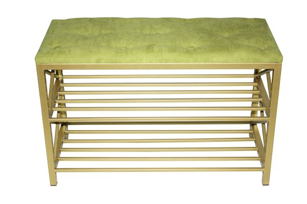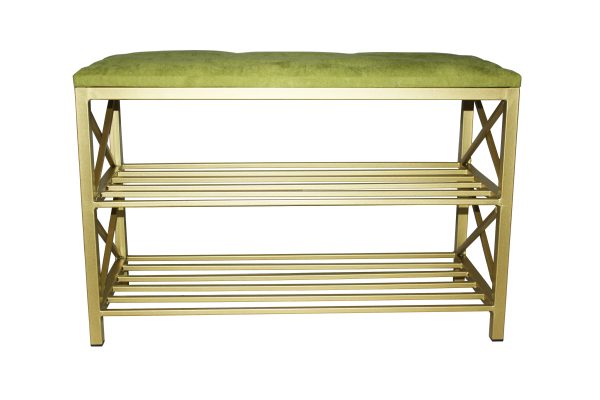 Чудовий стильний кований пуф, для вашої затишної передпокою або вітальні. Metal Art це великий вибір якісних та доступних за ціною пуфів, саме такого м’якого та стильного предмета меблів не вистачало у вашій затишній передпокої чи вітальні. У більш стриманий та строгий дизайн чудово впишуться скромно оформлені компактні моделі. Кований пуф – банкетка з полицями для взуття. Каркас – метал. Фарбування золотого кольору. сидіння-м’яка з гудзиками.