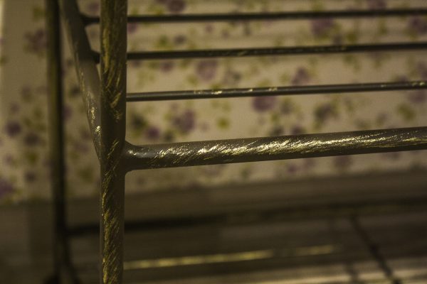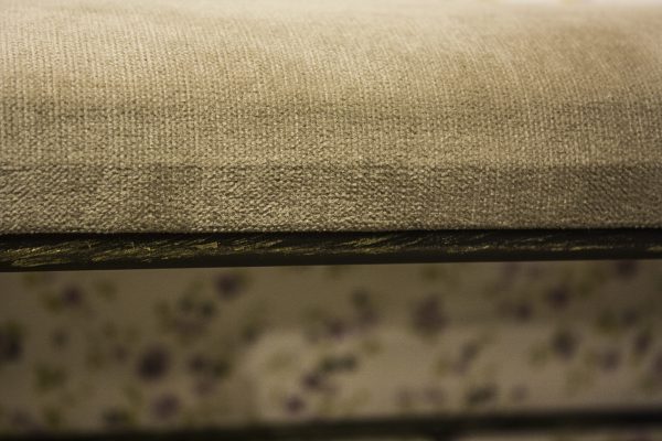 The frame is metal. Black paint, golden patina. Upholstery fabric.