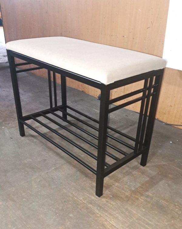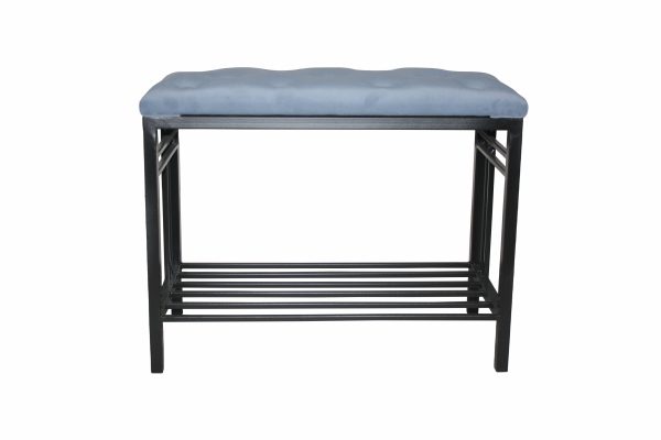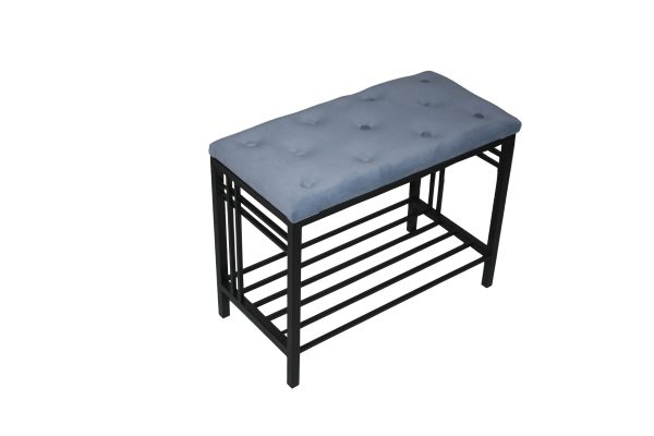 Чудова стильна та стримана банкетка- підставка для взуття “Берлін” з однією поличкою. Каркас – метал. Фарбування чорного кольору- або на вибір замовника. Оббивка сидіння-тканина велюр з гудзиками.