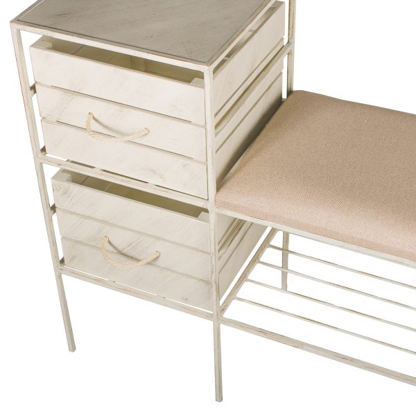 Чудовий м’який та стильний кований пуф, для вашої затишної передпокою чи вітальні. Кований пуф – банкетка в стилі Прованс з полицями для взуття та ящиками. Каркас – метал. Фарбування білий колір. Оббивка тканини. Довжина сидіння- 565 мм